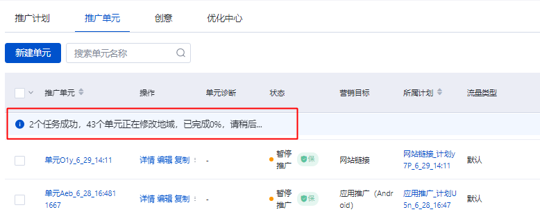 Step4:如您所選單元較多,則進入后臺任務。推廣管理列表會顯示當前任務進度(如下圖示意):