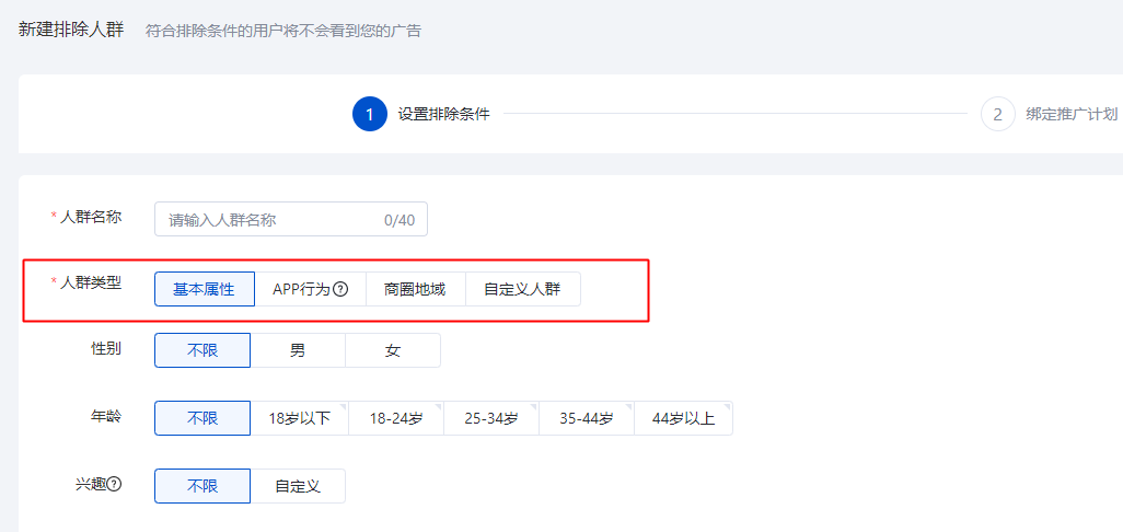 1.2 新建排除人群:支持按照基本屬性、APP行為、商圈地域和自定義人群四種類型做人群排除