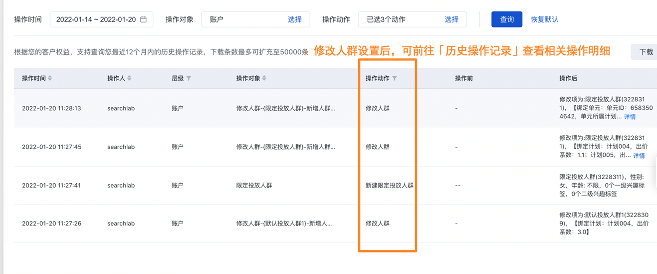 升級點3: 歷史操作記錄-人群操作記錄同步升級:修改人群設置后,可在歷史操作記錄中查看與下載