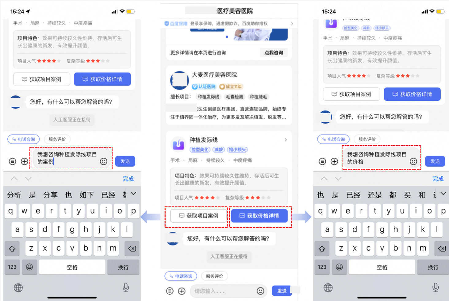 1)網(wǎng)民點(diǎn)擊“咨詢價(jià)格”,調(diào)起鍵盤在輸入框中預(yù)輸入“我想咨詢下XXX項(xiàng)目的價(jià)格”,用戶點(diǎn)擊“發(fā)送”為一條消息;