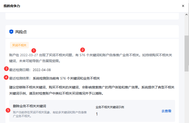 - 【我的競爭力】新增對存在少量不相關(guān)關(guān)鍵詞賬戶披露“買詞不相關(guān)”風(fēng)險點(diǎn)詳情、最近檢測結(jié)果、優(yōu)化建議