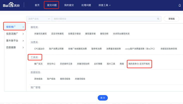 A2:如若發(fā)生“買詞不相關(guān)”判斷不合理情況,您可以通過風(fēng)鈴平臺進(jìn)行反饋。反饋路徑:搜索推廣-工具類-我的競爭力(買詞不相關(guān))。
