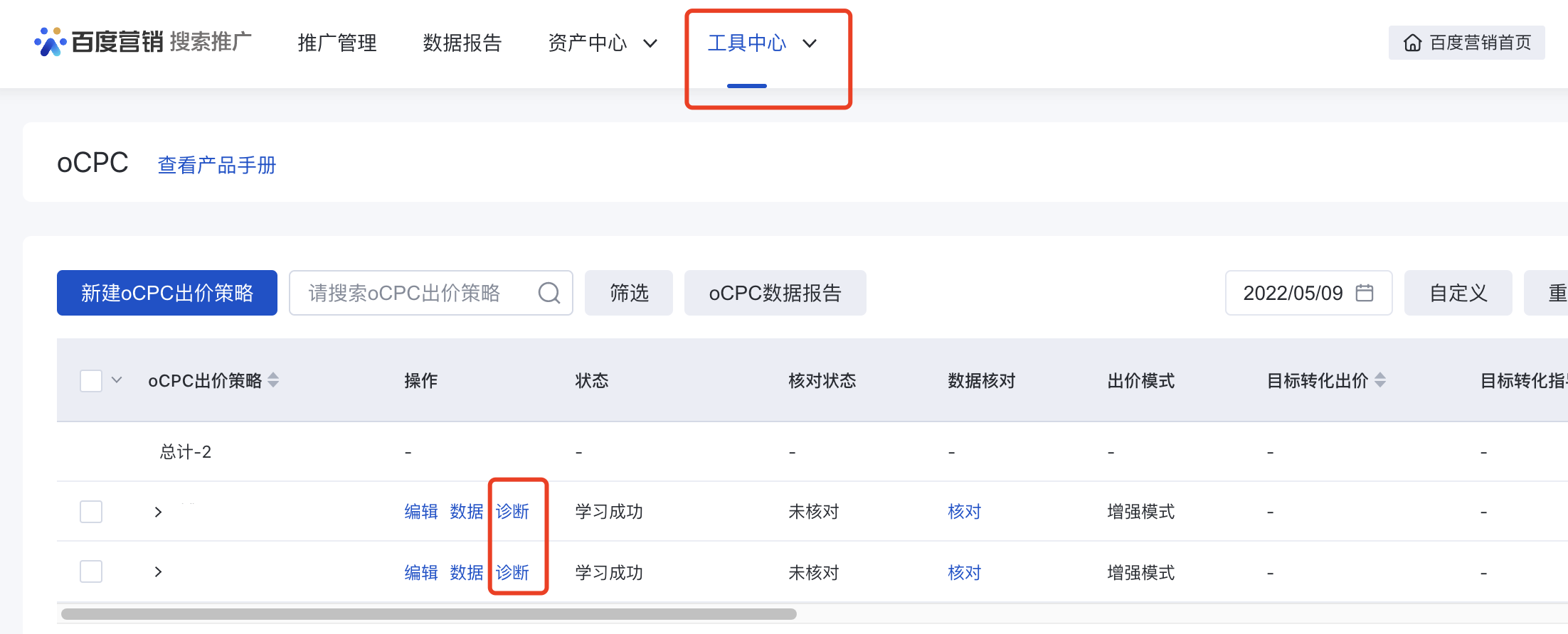入口1:工具中心-優化工具-oCPC-操作列-診斷