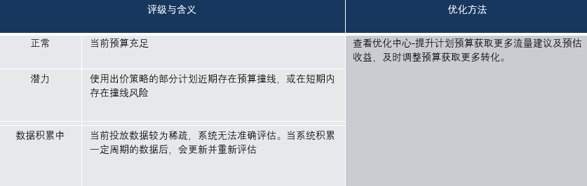 1)系統根據您出價策略所綁定計劃的設置及當前投放情況,對“流量定向、廣告質量、預算”等關鍵因素進行“風險、潛力、正常”評級,對“出價”進行學習狀態披露,幫助您及時了解當前投放情況;