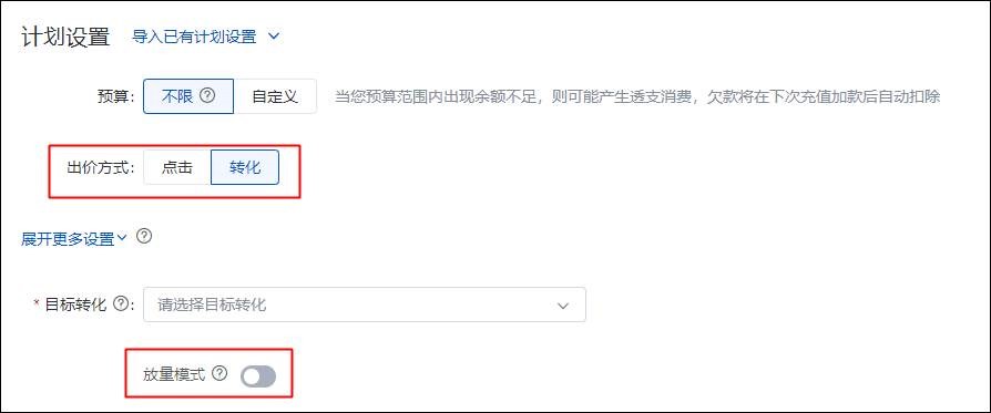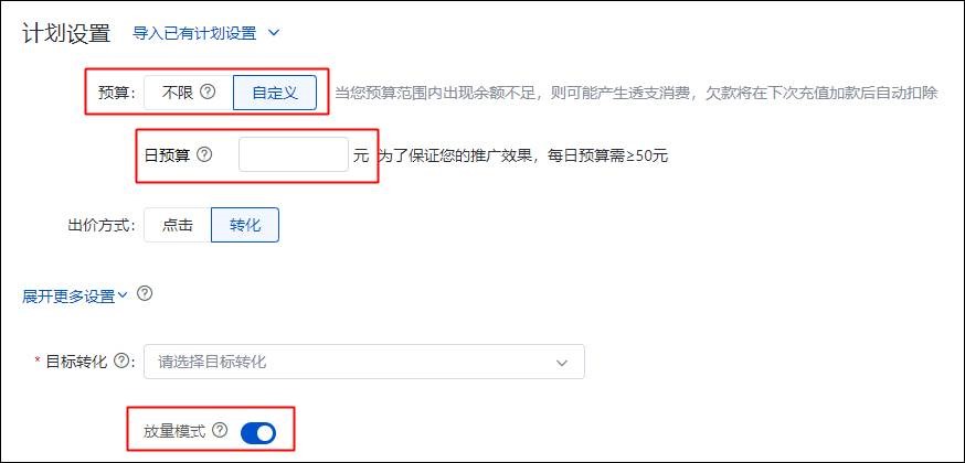 請注意:開啟放量模式,需明確設置計劃的預算(見下圖),預算設置不能太低,以便系統快速學習放量。