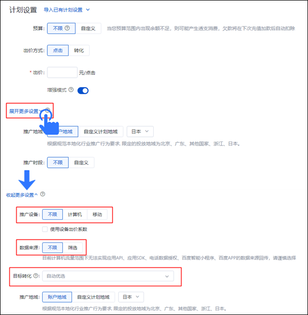 開啟“增強模式”開關,代表該計劃選擇增強模式出價方式。增強模式是傳統點擊出價的智能強化版,。使用增強模式可以結合點擊出價和轉化出價的優勢。對于已經使用基木魚(含營銷通)投放的推廣計劃,開啟增強模式后,系統會基于您的轉化數據進行轉化預估,動態微調點擊出價,在轉化成本平穩情況下,增加您的實際獲客。增強模式下,平均點擊成本在短期和局部范圍內,有可能小幅度超過您設定的出價。該模式適用于轉化數據較為稀疏,直接使用轉化出價(原oCPC出價)較難達到學習成功狀態的推廣計劃。開啟增強模式后,您可以在“更多設置“中可以設置目標轉化,當您不設置目標轉化時,系統會自動為您優選最優的轉化目標,并動態調整出價為您帶來更多轉化。詳情參見附件產品操作手冊。