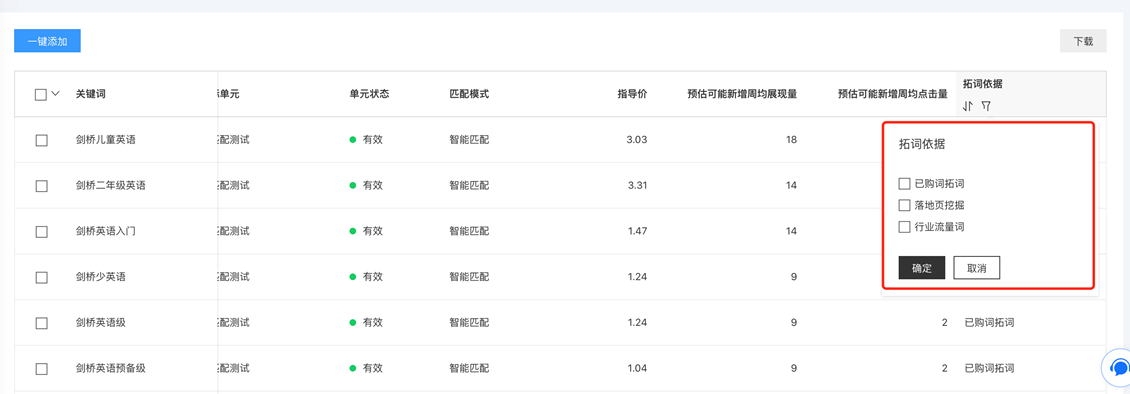 A2:廣告主可在關鍵詞推薦列表的「拓詞依據」列查看各推薦關鍵詞的來源,選擇更適合自己推廣業務的關鍵詞。其中「已購詞拓詞」是指根據廣告主近期購買的關鍵詞,提供搜索用戶所關心的同類好詞;「落地頁挖掘」是根據廣告主近期的推廣落地頁的內容,提供和落地頁信息相關的新關鍵詞,幫助提高落地頁相關性;「行業流量詞」根據近期同行業的用戶搜索趨勢,提供用戶搜索熱度較高的關鍵詞,幫助您及時追蹤用戶熱點。