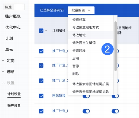 1. 支持全選計(jì)劃、單元或定向(關(guān)鍵詞、人群、網(wǎng)址、詞包)進(jìn)行批量操作,提升批量能力;
