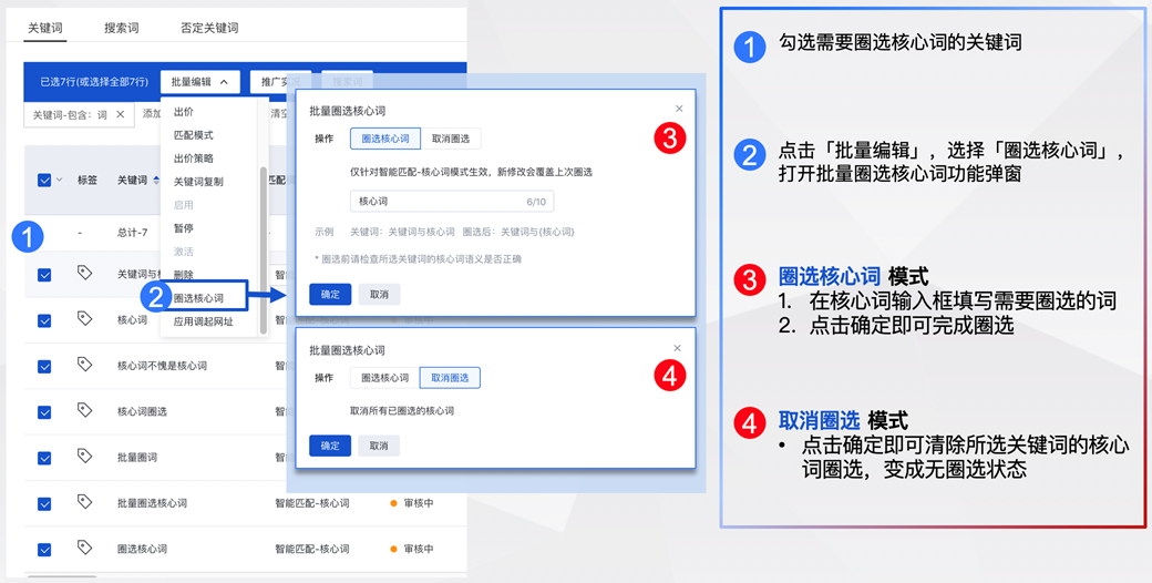 勾選關(guān)鍵詞,點(diǎn)擊「批量編輯」,選擇「圈選核心詞」觸發(fā)二次確認(rèn)場景,自動彈出二次確認(rèn)彈窗
